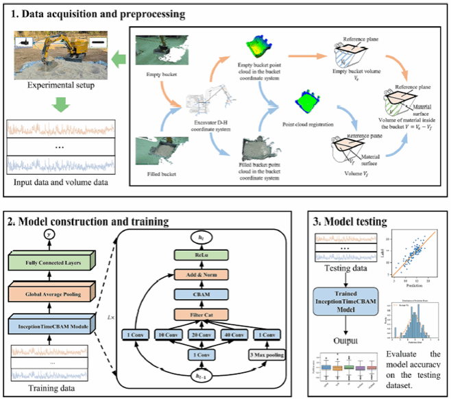 为提升挖掘机的自动化作业能力,IDEAL团队基于多传感器数据融合,结合深度学习技术,提出了一种铲斗填充率预测方法。该研究可实现实时预测挖掘机铲斗的填充状态,为自动化装载和智能调度提供重要支持。相关成果发表在中科院一区Top期刊Automation in Construction。