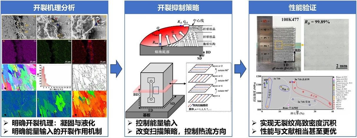 异种镍基合金在增材过程中的开裂行为,严重影响合金力学性能。虽然成分设计、外场辅助等开裂抑制手段具有一定的开裂抑制效果,但无法满足复杂构件的工程应用。IDEAL团队提出了一种可操作性强的开裂抑制策略,实现异种镍基合金的开裂抑制以及力学性能调控。该研究为复杂构件的增减材复合制造及其工程应用提供了基础工艺支撑。相关成果发表在中科院一区Top期刊Virtual and Physical Prototyping。